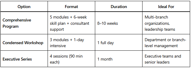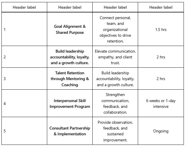 The Retention Through Alignment workshop is designed to strengthen organizational stability and long-term growth by aligning people, goals, and communication.